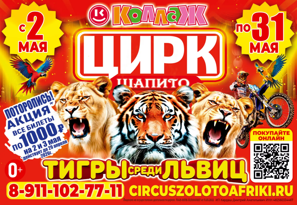 В программе: африканские львицы и амурские тигры, мотокаскадеры, воздушные акробаты и гимнасты, парящие под куполом без страховки. А также зоопарк чудес: кенгуру, говорящие попугаи, дикобразы! Цирк будет дарить вам яркие впечатления со 2 по 31 мая на парковке ТРК «Коллаж».
